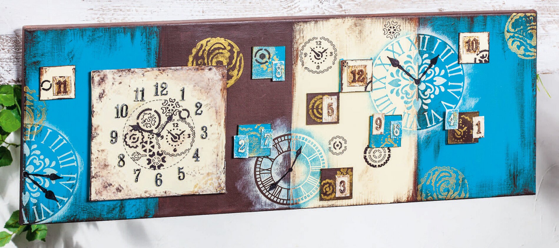 Completely in the current mixed media style, Stretched Canvasdifferent materials and painting techniques are combined to a timelessly beautiful mural. The picture consists of Stretched Canvas, different sized stamps Painting boards, and stencils as well as glued on clock hands and numbers.
