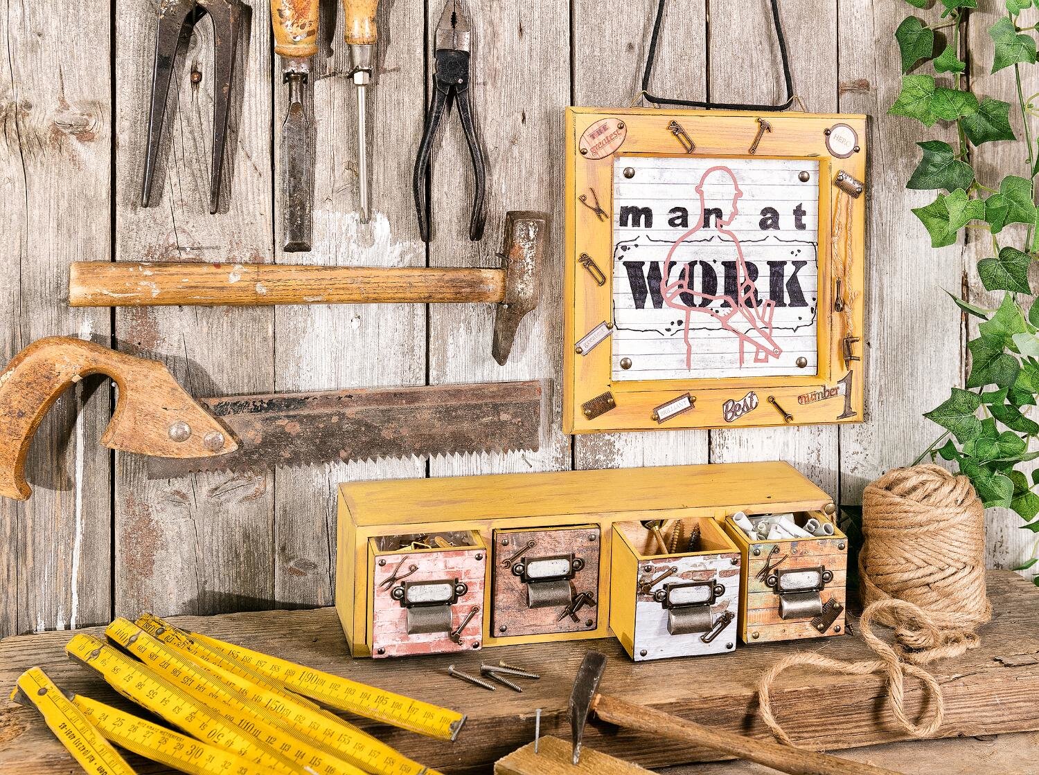And it is so easy to decorate the wooden frame Just like the drawer box, the wooden frame is first decorated with VBS Hobby Color Ochre primed and then achieved the used look with the wiping technique in Grey Brown . Cut out small elements from the paper block and stick them together with selected charms on the wooden frame - the arrangement is left to your creativity. Now cut out the picture section "Man at Work" and fix it in the picture frame. Then attach the eyelets to the back of the wooden frame and pull the paracord cord through them - done.