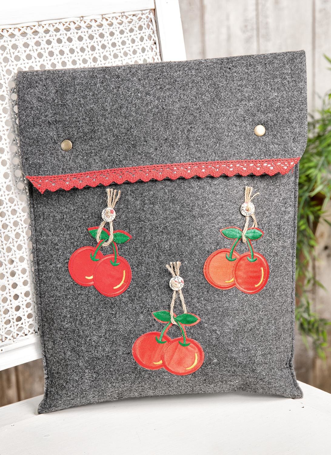 Then iron the cherry appliqués onto the felt bag and glue the threads together with the buttons.