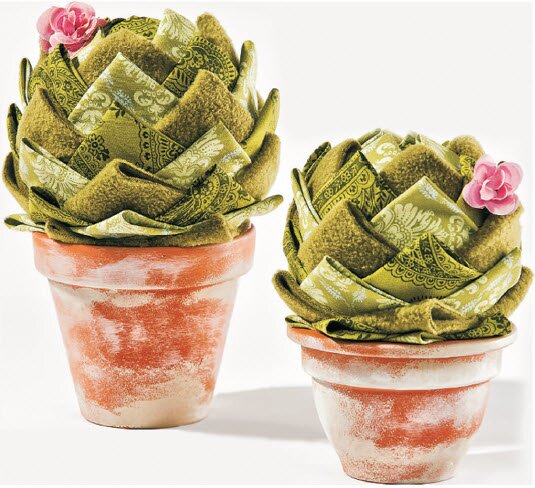 Wipe antique white Handicraft paint with a Paint sponge over the Terracotta-pots and let them dry. Glue the artichoke balls to the pots with hot glue. Single flowers from Remove the spring pick and attach to the "cactus" with a Pin