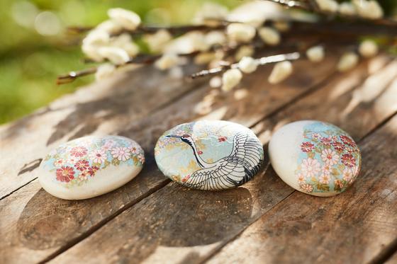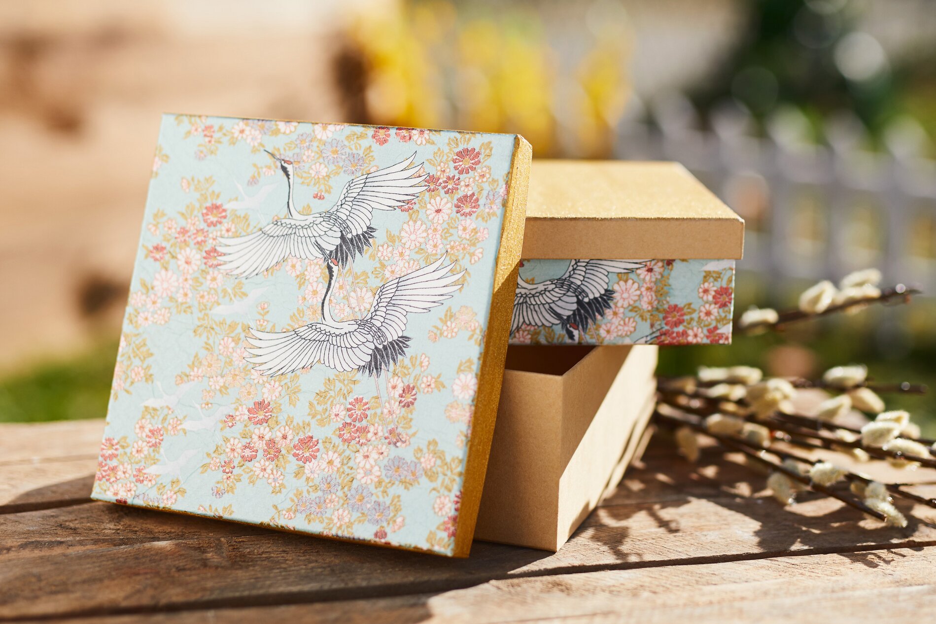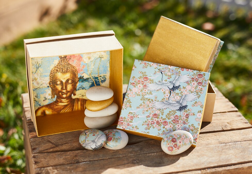 Coat the inside parts of the large square box with golden paint, the bottom with white After Handicraft paint. drying, coat the bottom with Carefully Napkin place Napkin varnish. the top printed layer of the Napkin varnish.