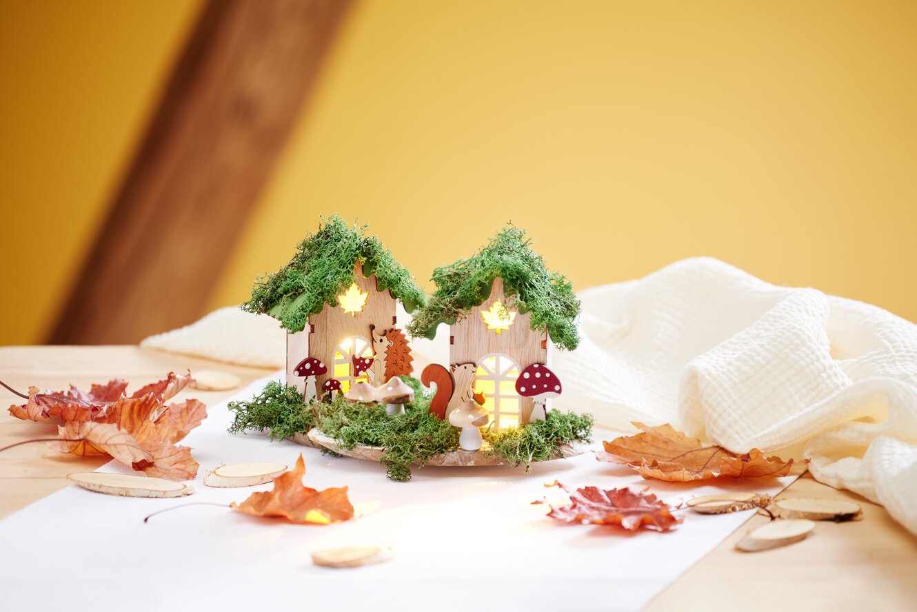 Now you can decorate the fall arrangement. Glue moss and mushrooms around the houses. This will give you an idyllic autumn landscape. Distribute the decoration so that it creates a balanced overall picture and all the elements are shown to their best advantage.