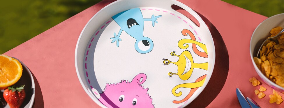 This colorful and cheerfully painted bamboo tray inspires young and old. With the painted funny monsters it is the absolute hit for children. With our free template you succeed in re-painting in no time.