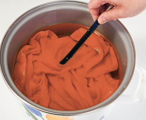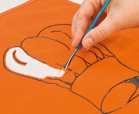 First the apron is dyed with batik technique. After the apron has dried and been ironed, place the patterns under the fabric and transfer the contours of the motif with a line-ex pen, then colour in with Fabric paint