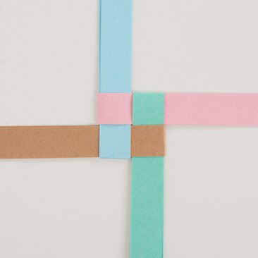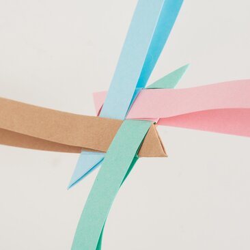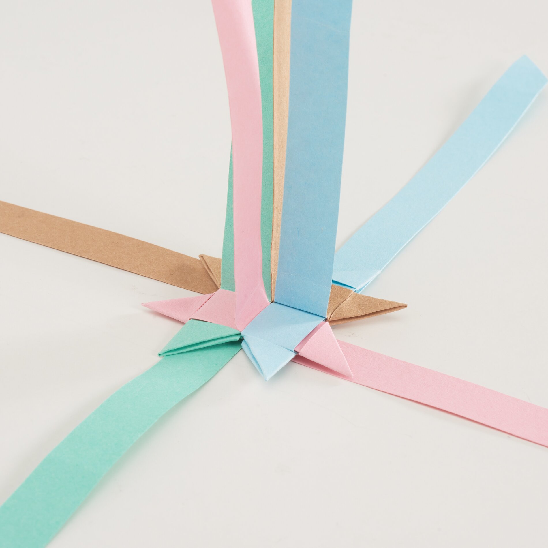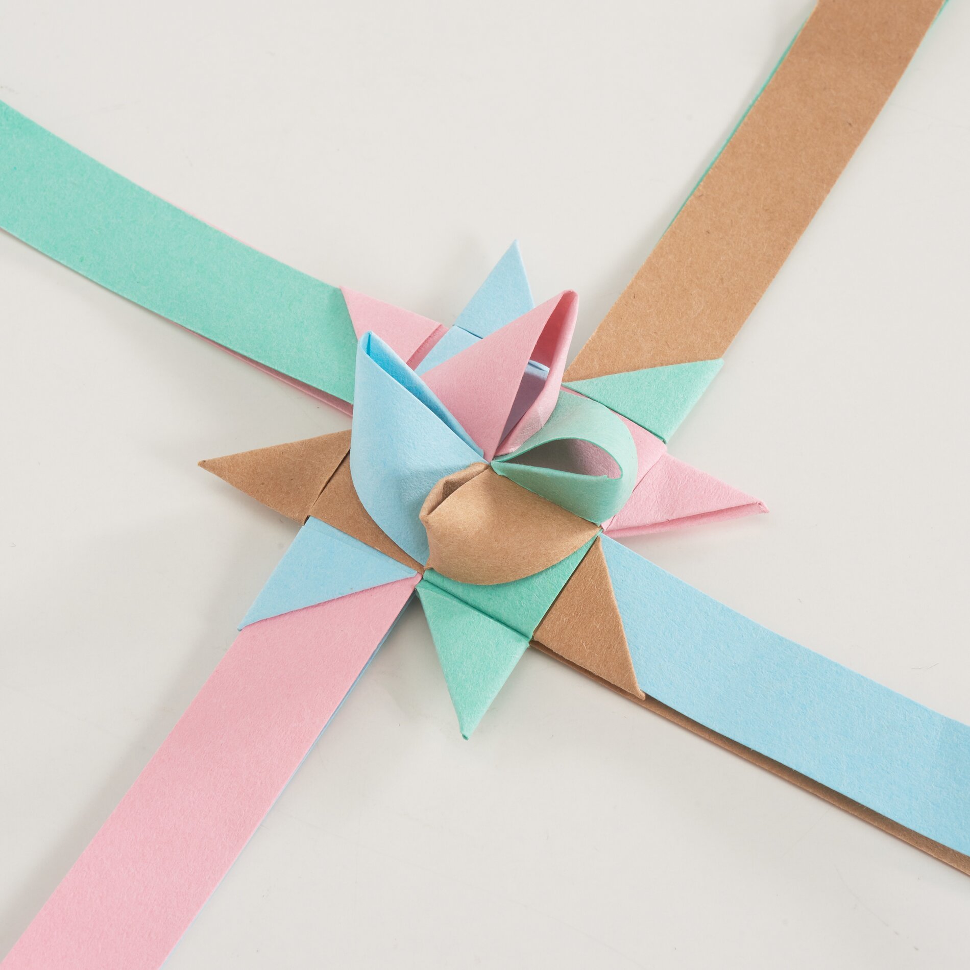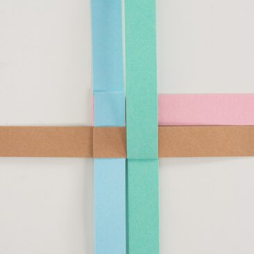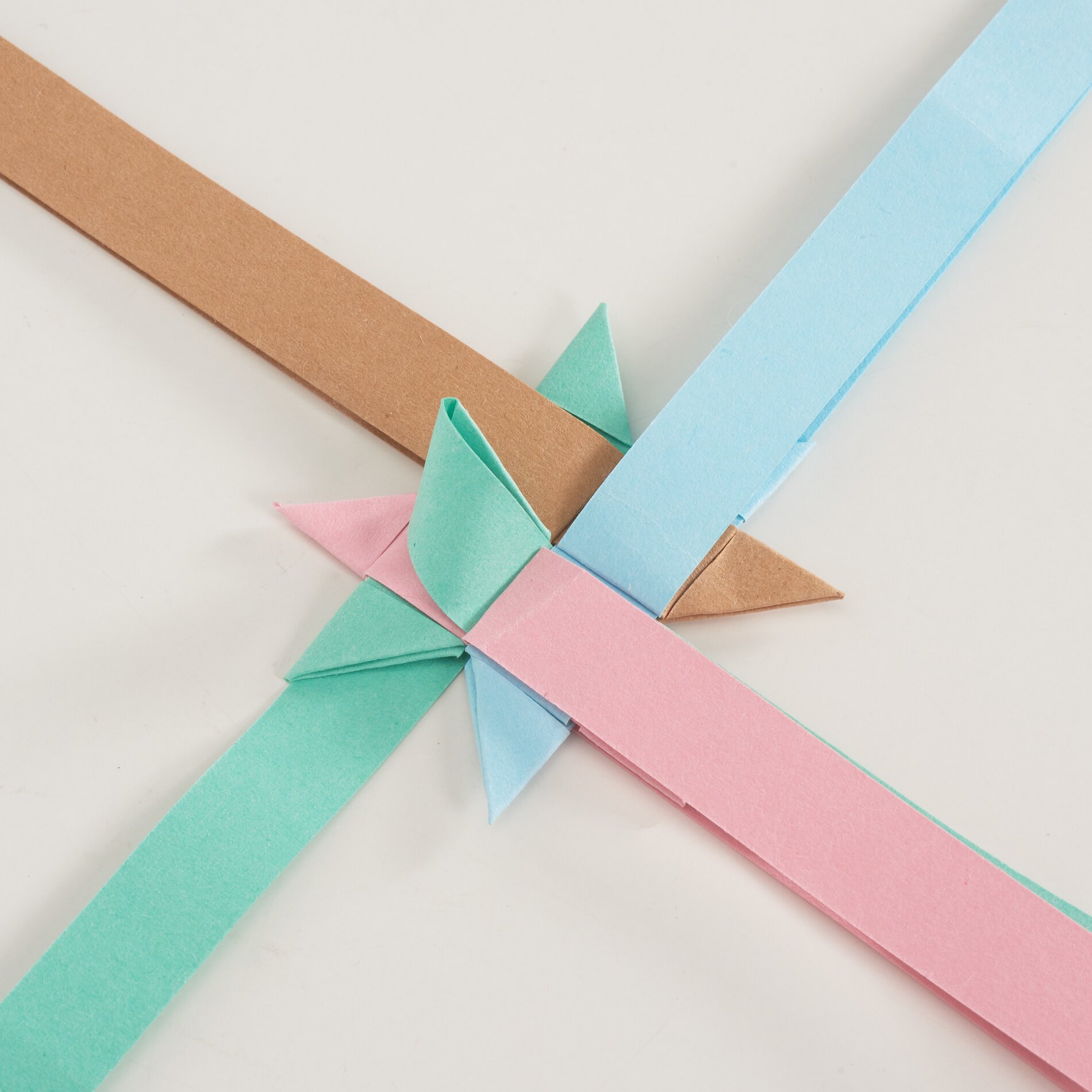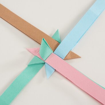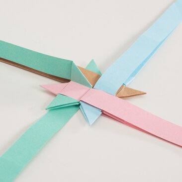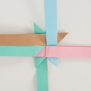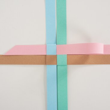 Bend the paper strips, in front of you at the top left (the green strip in our example) away to the outside of the star..