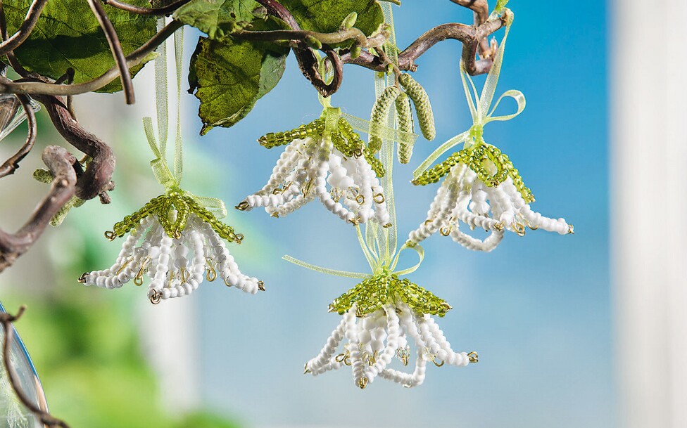 In this way, the wire stars and rocaille beads are gradually transformed into beautiful calyxes reminiscent of snowdrops.