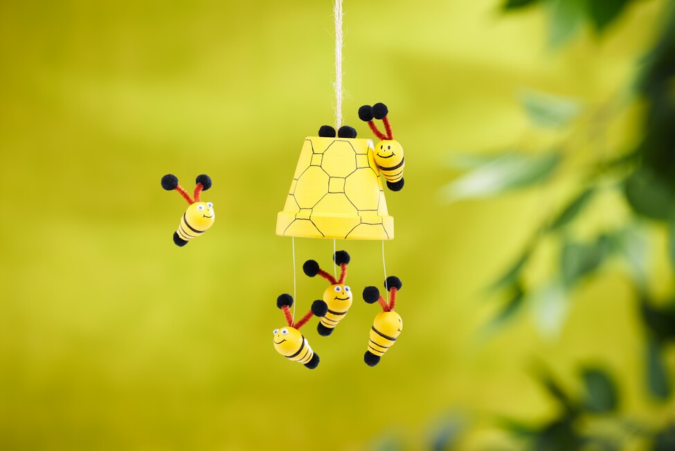 Finally, cut a piece of jute ribbon , knot the ends and pull it through the hole in the terracotta-pot from the inside. Fix it with some hot glue so that it holds securely. Now it's time to assemble your mobile. Attach the Perlon threads of the small bees to the inside of the large terracotta-pot using hot glue. Make sure that the little bees can swing freely. As the icing on the cake, glue three more pompoms next to the suspended jute ribbon. Done!