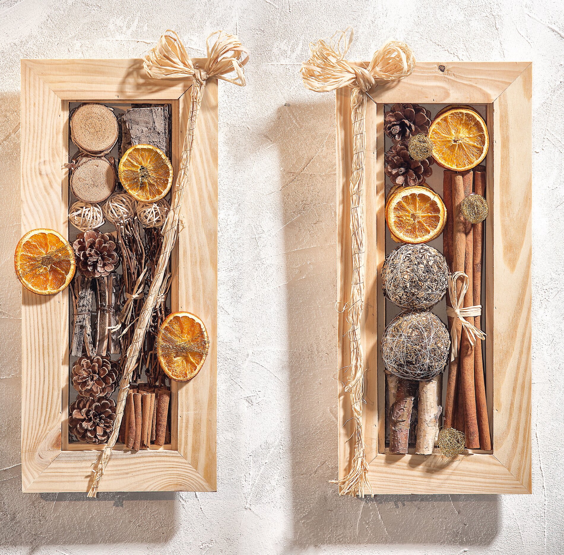 These two decorative bowls are hung on the wall. They are filled with natural cinnamon Wooden discs, sticks, cones and much more. The bouillon effect wire sets glittering accents.
