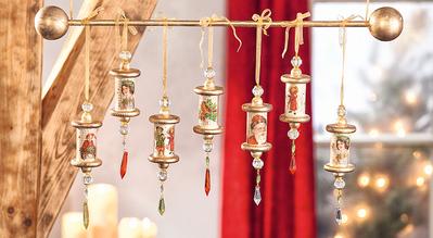 Bei dieser Hängedeko haben wir uns was ganz schlaues ausgedacht und einfache Holzspulen weihnachtlich gestaltet und an einen Rundstab gebunden. Das Ergebnis kann sich absolut sehen lassen und glänzt natürlich in tollem Gold. Vielleicht habt ihr ja noch alte Holzspulen herumliegen, die ihr jetzt mit dieser Dekoration sinnvoll nutzen könnt.