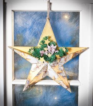 Als tolle Hängedeko für Türen und Fenster ist der „Goldene Stern aus Holz“. Ein echter Hingucker und so einfach zu basteln. Das tolle Fach bietet ausreichend Platz für Tannenzweige und Accessoires zur Verschönerung.