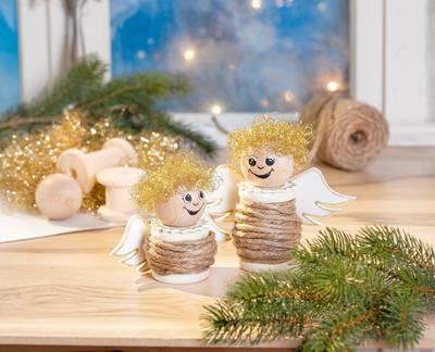 Bei meinem Favoriten kommen die bekannten Holzspulen wieder ins Spiel. Mit Jutegarn umwickelt geben sie nämlich einen tollen Körper für Engel her. Holzkugeln drauf gesetzt und mit prachtvollem, goldenem Haar beklebt, erhaltet ihr zwei niedliche Weihnachtsengel als Tischdekoration. Mir bereiten die Engel Freude und zaubern mir immer wieder ein Lächeln ins Gesicht.