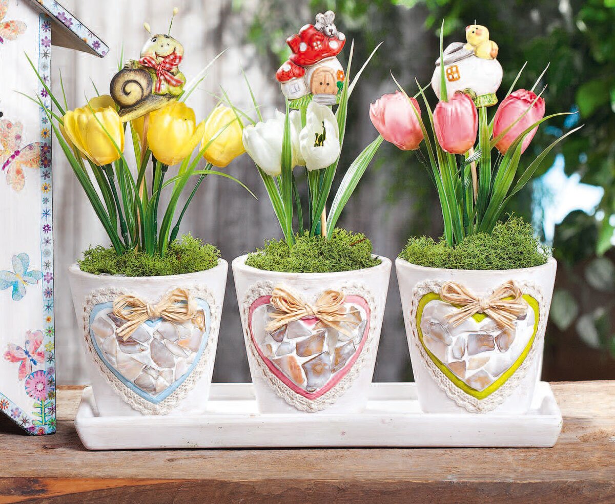 With one you Paint sponge wipe white over Handicraft paint the pots and when everything Coaster. is dry you paint the borders Flat brush of the hearts with one VBS Hobby Color in May green, and Old Pink turquoise blue around the hearts. Lighten the handicraft colors with white. Stick the lace on with tape.-Ribbon Tie small bows from the natural bast and fix them to the pots with hot glue. Now cut the dry tile to fit the pots, stick the mixture into the pots and decorate them to your heart's content with the tulips, Iceland moss and other accessories.