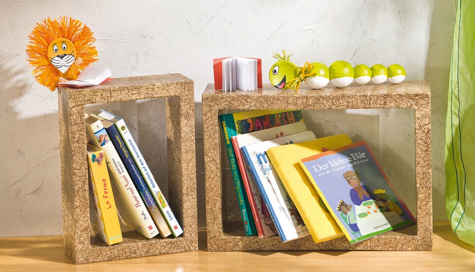 Next, drill the Polystyrene balls with a hand drill (your mom will surely help you with this) and put it on the cooking spoon. This will then become the bookworm. Paint it white and green and draw the face with a pencil, so you can paint it better. Now he gets a loop of green and yellow Raffia and hair from green Raffia. You glue it carefully with hot glue.