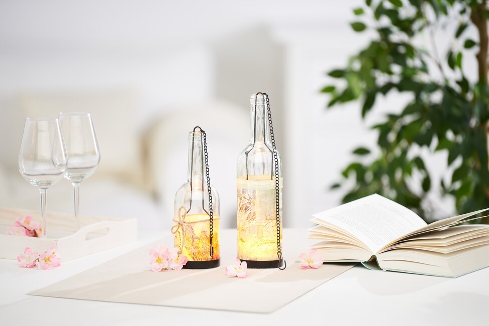 If you now place an LED tea light in each bottle, your bottle lanterns are ready to hang.
