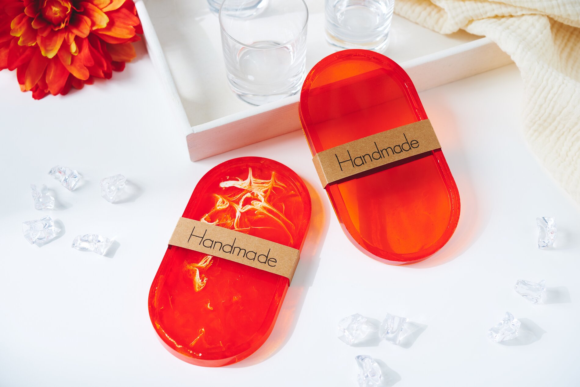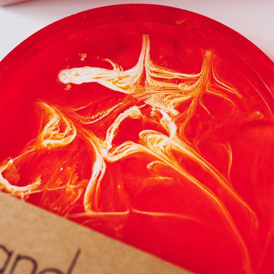 orange For the marbled version, proceed as described above, but add a little color in further and white to the mixture in the casting mold. Go through the colors with a bamboo skewer to create a pattern. When you are happy, blow-dry over it again and leave it to dry.
