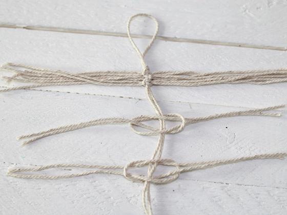 Now place your individual yarn sections once above and once below the long thread. The end pieces are always placed under the loop of the other section.