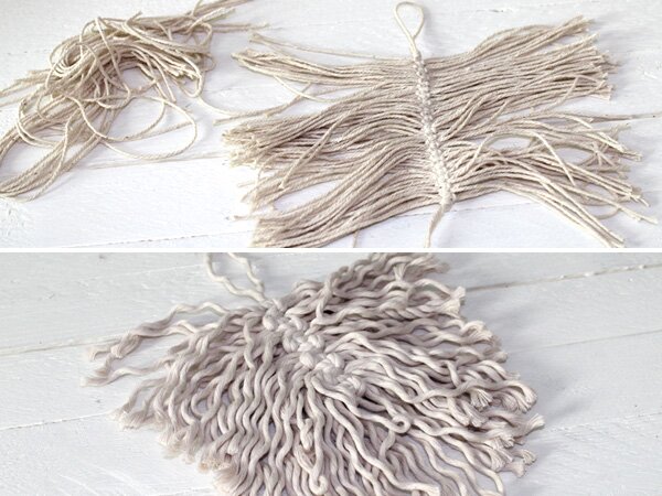 For my variant, they are Feathers partly threaded Warp yarn on one piece and partly knotted tightly. Wrap this around the branch and fix it Yarn to the outer eyelets.