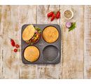 Ideal for all burger fans: Make your own burger buns with this great sturdy burge-Baking tin r made of carbon steel. The shape has a size of approx. 28 x 28 cm, a height of approx. 2.8 cm and is heat-resistant up to 230 °C. The small holes in the bottom help to let the warm air circulate better so that the buns become really fluffy. You can bake four buns of approx. Ø 12 cm at the same time. Due to the good non-stick coating the buns can be easily removed from the mould.