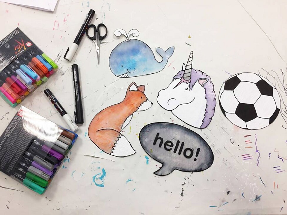 Preheat your oven to 120 °C (top/bottom heat). The cut-out motif is placed on a baking tray covered with baking paper with the painted side facing upwards. Don't worry, it is normal for the film to partially curve during the shrinking process. When it is lying flat on the tray again, you can take the film out of the oven.