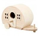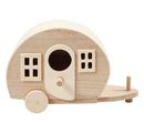 A wonderful caravan made of raw wood/plywood with a length of approx. 18 cm x width 8 cm x height 11 cm. The caravan is beautifully finished with windows and a door at the front and closed at the back. The door has a hole with a Ø of approx. 2.9 cm.