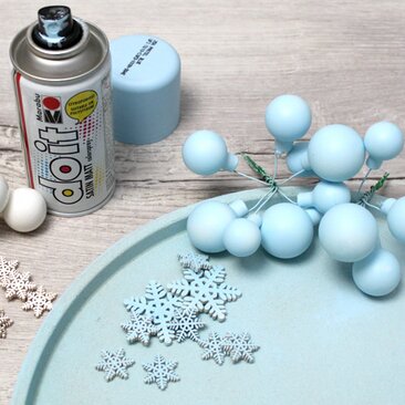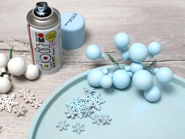 First spray the plate, some of the balls and also some of the snowflakes with the paint. It is best to do this outside and with gloves.