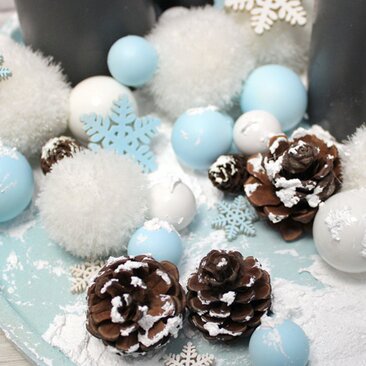 Then you can decorate the plate with snowflakes and cones. To make everything look more coherent, add a little snow to the decoration.
