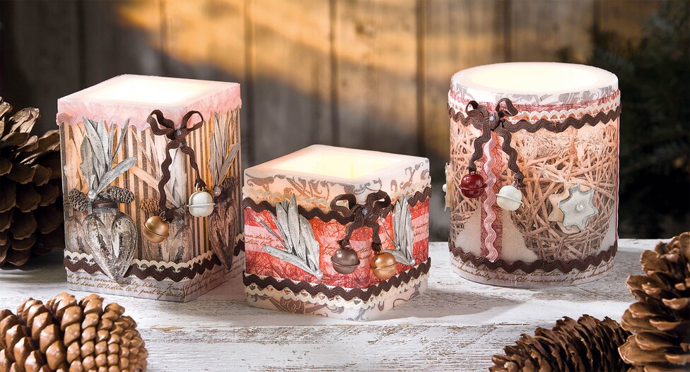 Zig-Zag-Ribbon, bobbin lace or narrow Satin ribbon according to taste with double-sided Adhesive tape on the candles.
