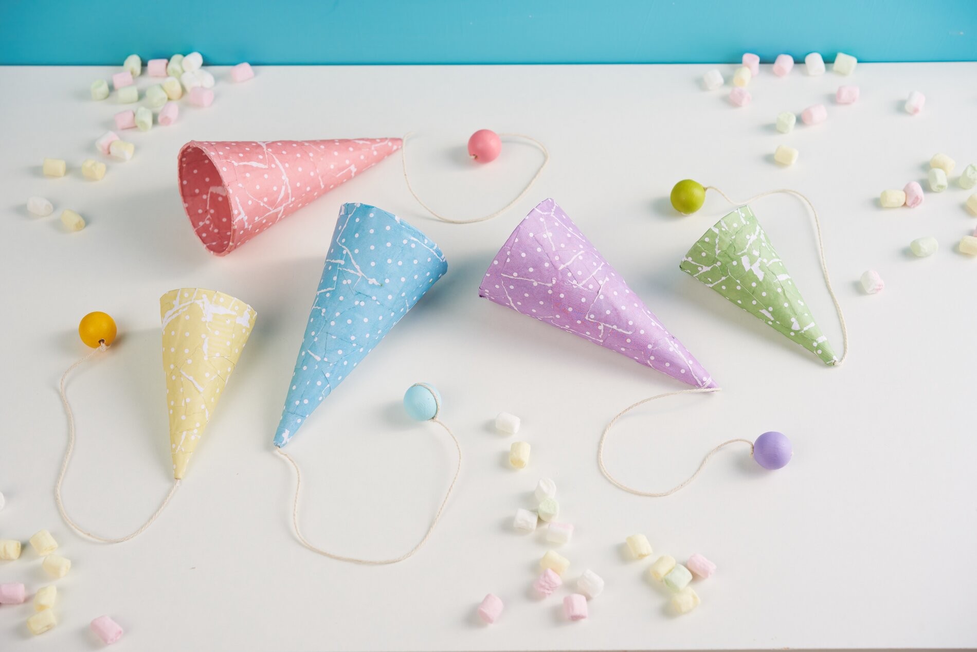 5. Make a thick knot at one end and pull the other end through the hole in the cardboard cone from the inside. Knot the wooden ball to the end that hangs outside.
