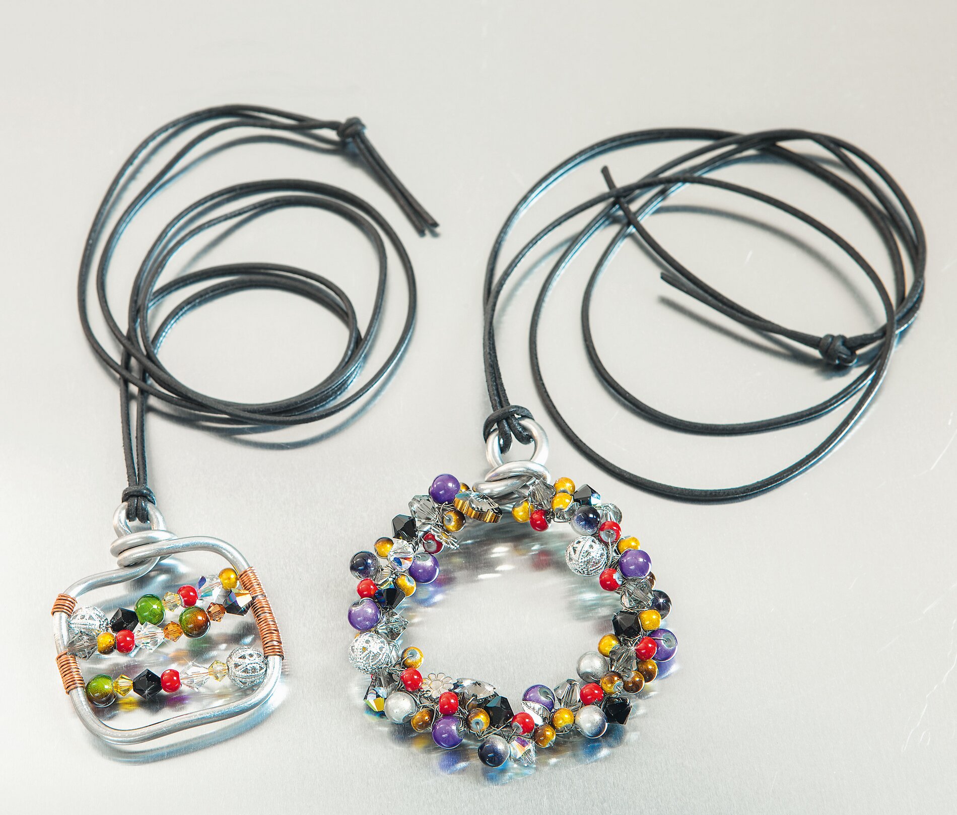 Make an eyelet from aluminium wire with the round nose pliers, then bend it into a circle or rectangle. These are the basic shape of the pendant.