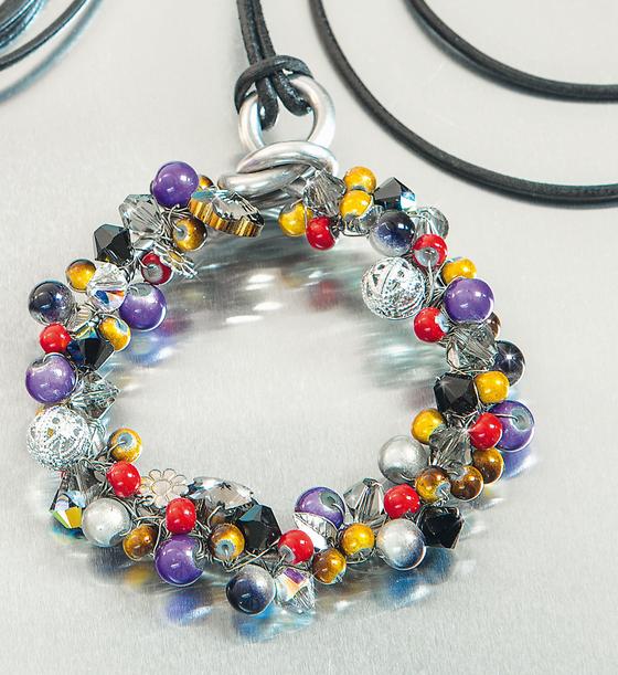 For the round pendant, thread Swarovski and aluminium filigree beads, Miracle Beads and gemstone pendants onto the bouillon effect wire and wrap tightly around the wire ring until it is completely covered. Shorten the end to fit and press on.