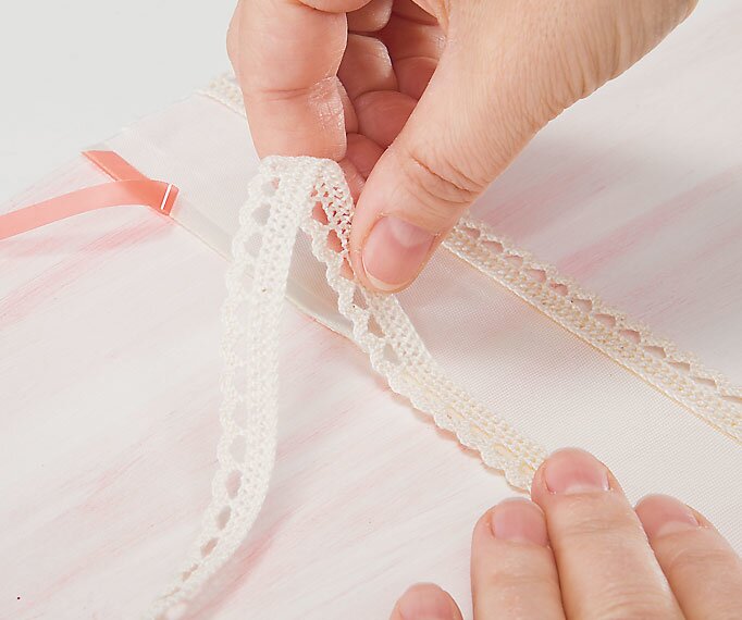 A narrow Lace ribbon is glued around the lids with double-sided Adhesive tape , a wide glued Lace ribbon decorates the lid. Rose blossoms and leaves are arranged on the lid to a great look and fixed with hot glue