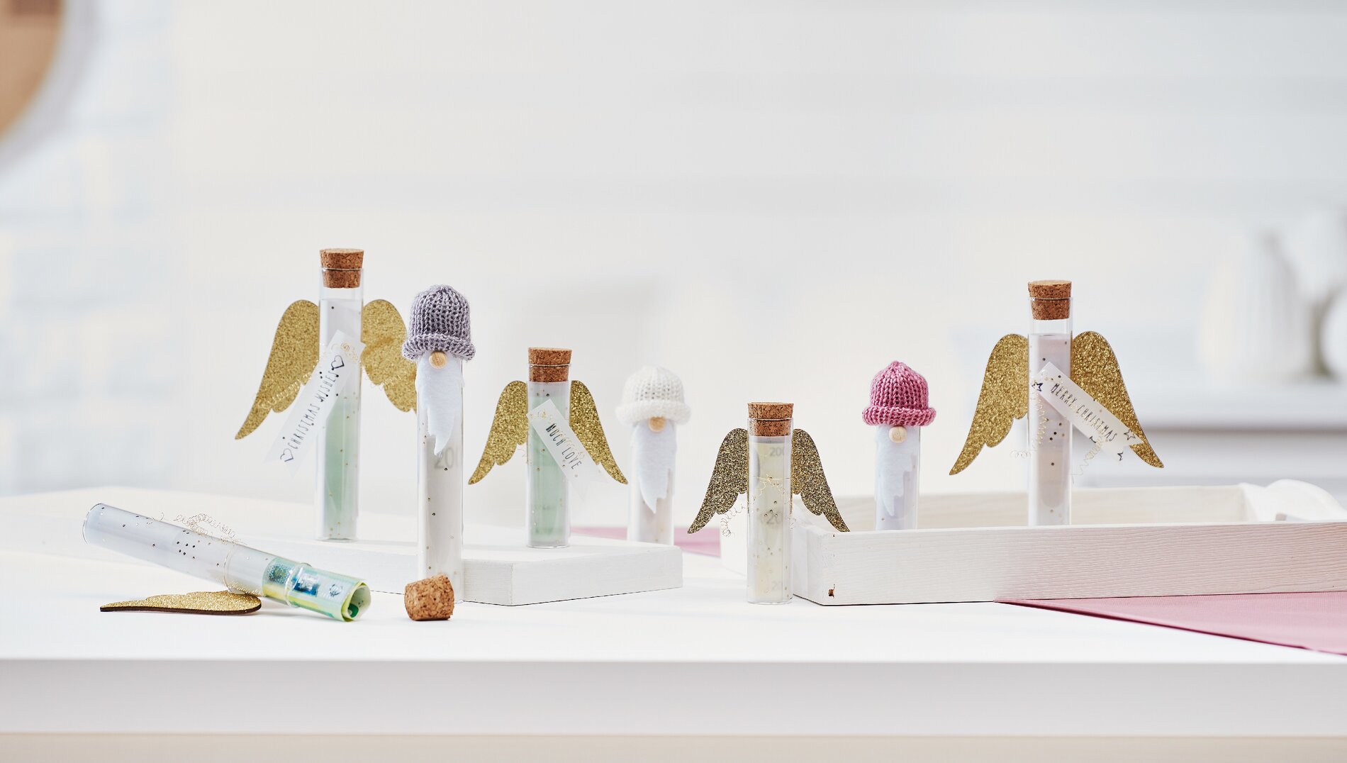 Tie about 30 cm of enameled copper wire around the middle of the angel wings. Put some hot glue in the middle and press the test tube onto it. Then wrap the wire around the test tube and twist the ends.