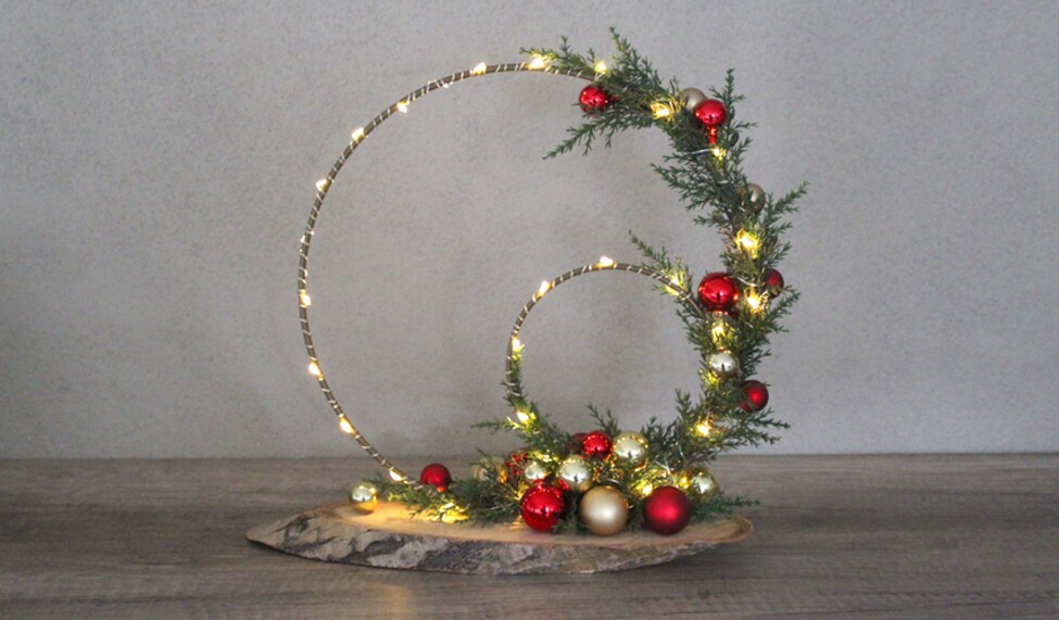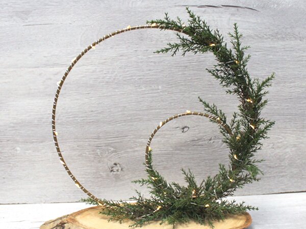 Decorations with metal rings are a big trend and eye-catcher. In this example, however, not only baubles are used, but the whole thing is combined with fir greenery and a second ring is also used.
