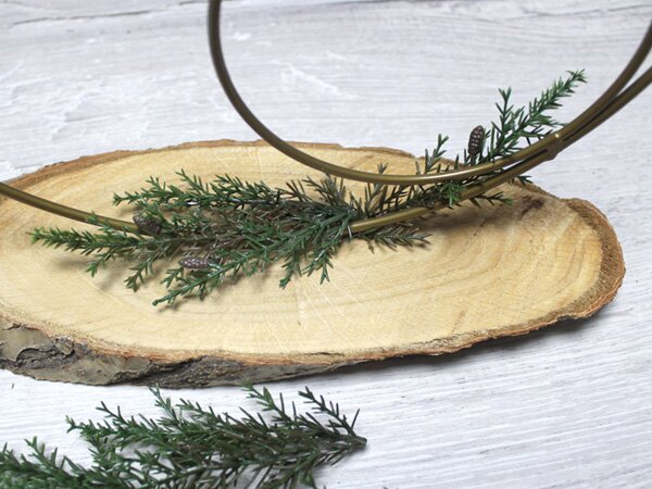 First use the twigs to hide the glue spot on the wooden disc and then glue the ring piece by piece. At the base, the branches can go in all directions. On the ring, you should only work in one direction.