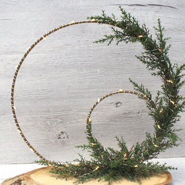 Once you have attached enough greenery to the ring, wrap the fairy lights around the ring. It is best to start where the small and large rings meet at the top - on the right in the picture. From there, go around the small ring once and then continue to the large ring. Finally, you can hide the battery compartment behind the pine greenery.