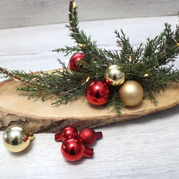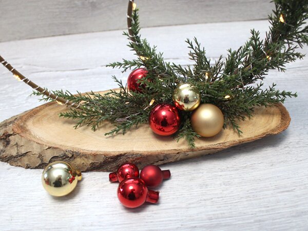 The last step is to glue on the ball. Remove the wire and fix it with hot glue as close as possible to the greenery/wire.