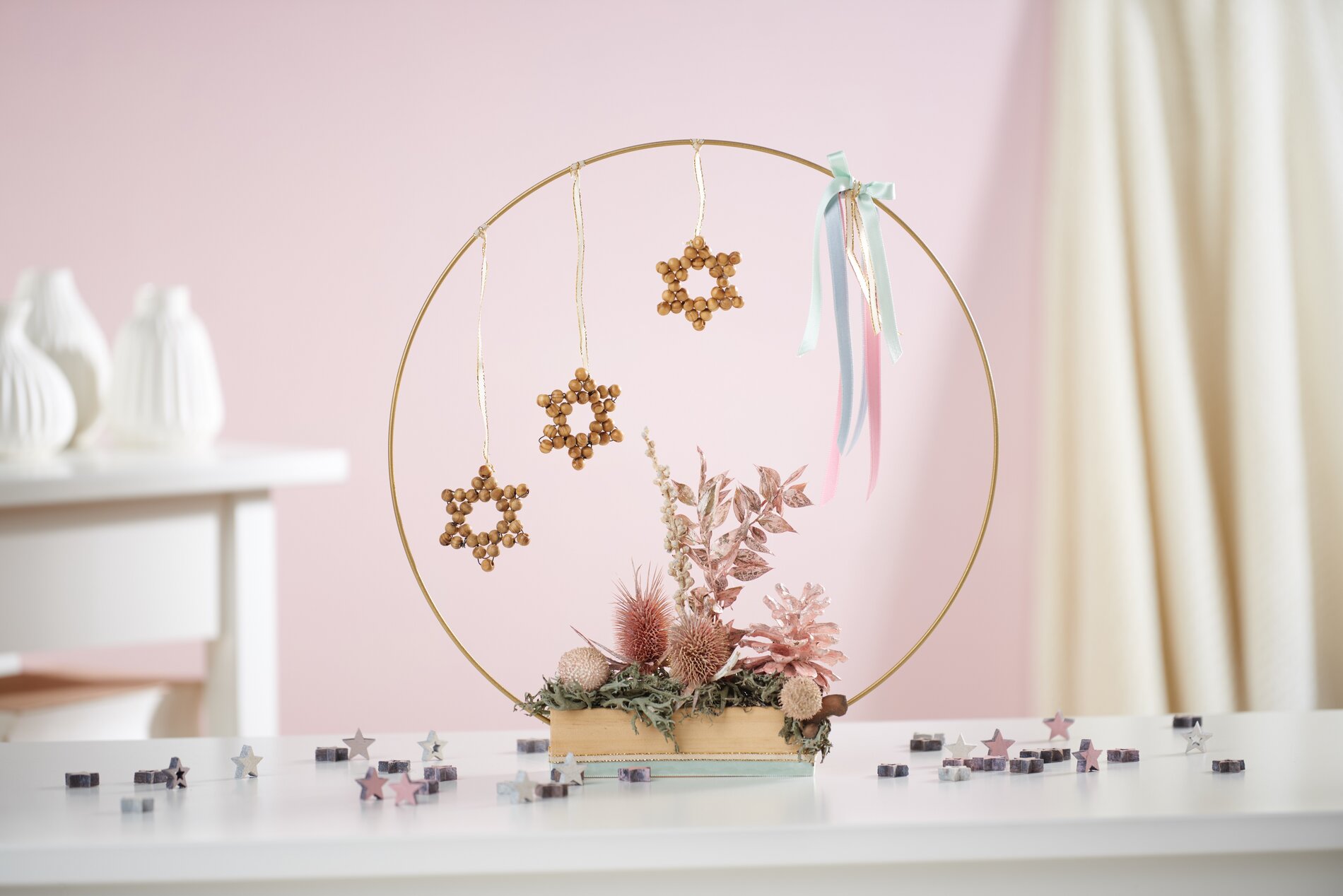 Now it's time for the finishing touches. Tie a satin ribbon around the bottom of the wooden stand. Then you can place the metal ring in the wooden stand and fasten it. Next, place the dried flowers accordingly in the existing holes, put some moss around it to cover the holes. Finally, you can knot the wooden ball stars you have made, as well as more satin ribbon to the metal ring. Your Christmas metal ring is ready.