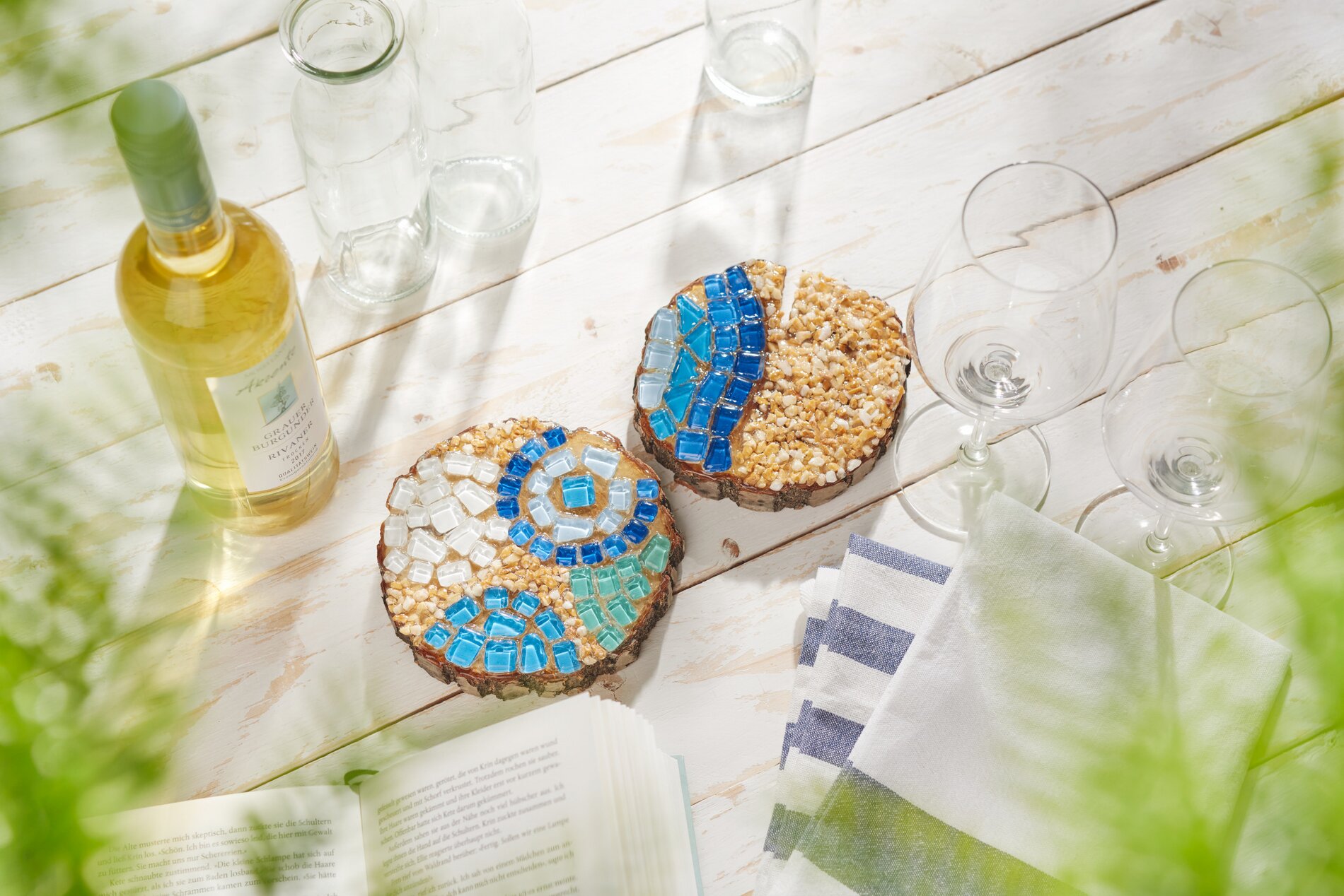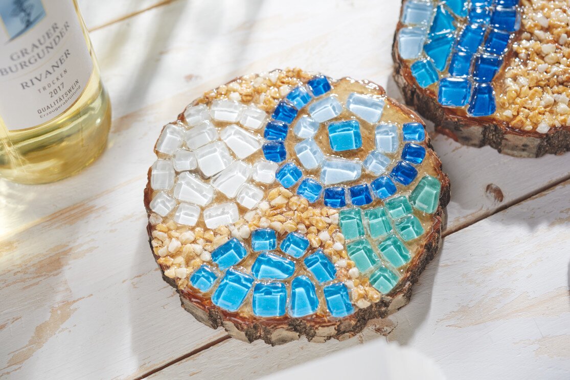 The basis for each coaster is a natural tree slice. First, select mosaic stones and place them on the tree discs.
