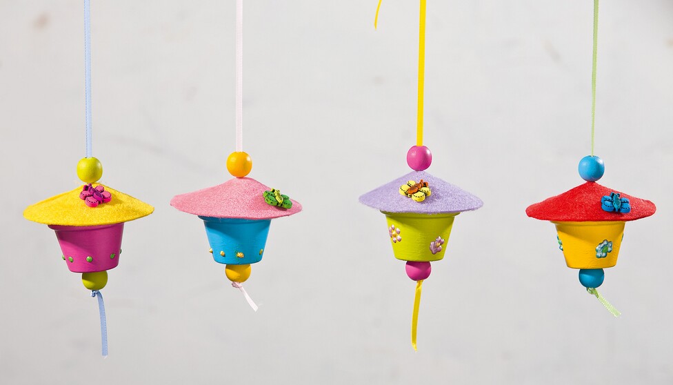 When the paint and beads are dry, thread Satin ribbon through the hole in the pot and knot it with a ball. At the top, thread it through the felt roof and glue it to the pot. At last you thread a second Pearl make a loop in the Ribbon and stick a butterfly on the roof - ready are your colorful "birdhouses".
