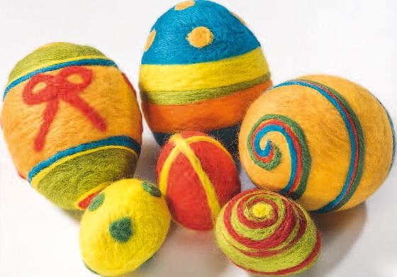 The round dots are created by rolling some wool between the fingers into a ball and felting it onto the egg from the centre outwards.