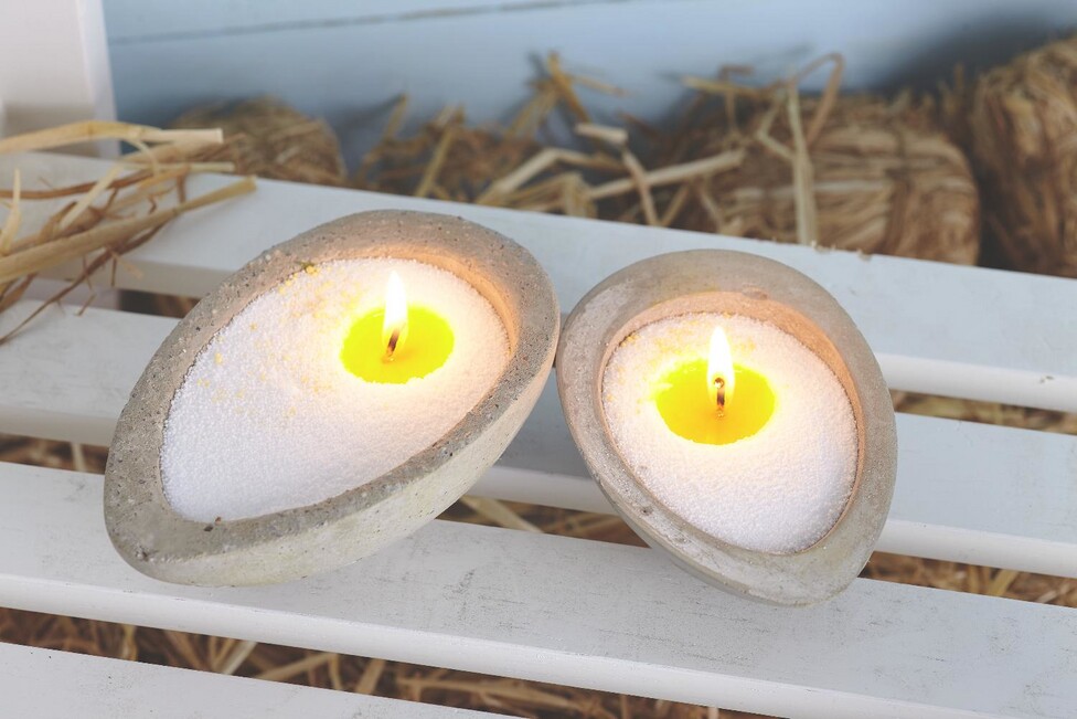 Each concrete egg is cast from a large and a small Acrylic-egg half. The large egg half is spread with oil, filled with cast concrete, the second small egg half is pressed into the concrete mass and weighted down with a Stone or similar. This creates a recess into which the candle sand can be poured later.