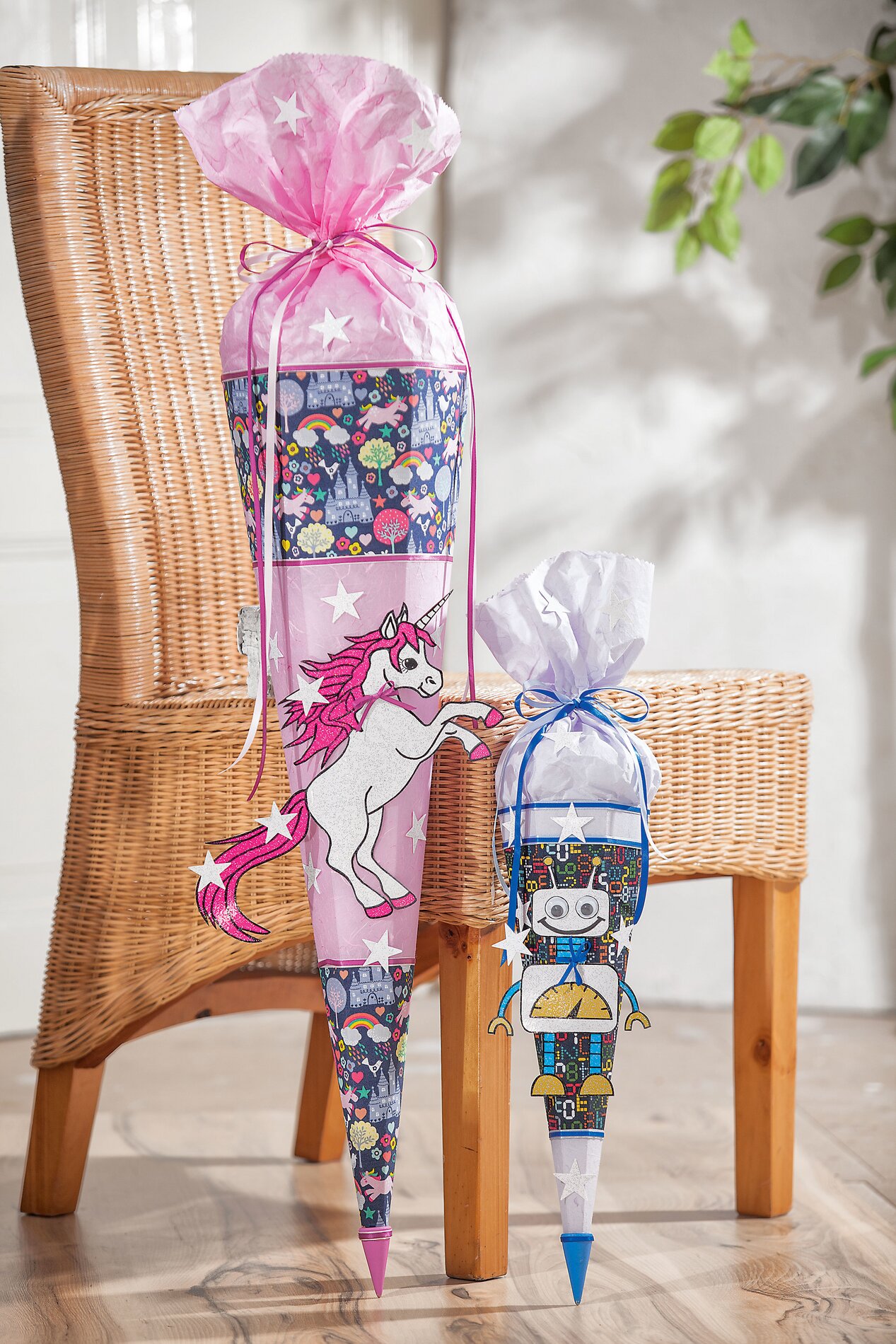 You can download the unicorn and the robot as a motif template here. The motifs will look especially good if they are not only with colored photo cardboard but also with glitter paper.