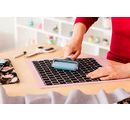 The fabric can be laid completely smooth with the pressure roller without folds and creases. It also increases the adhesion of the fabric to the mat for even more precise results. With the help of the tweezers, fine threads and excess material can be easily lifted off the mat without damaging the adhesive surface.