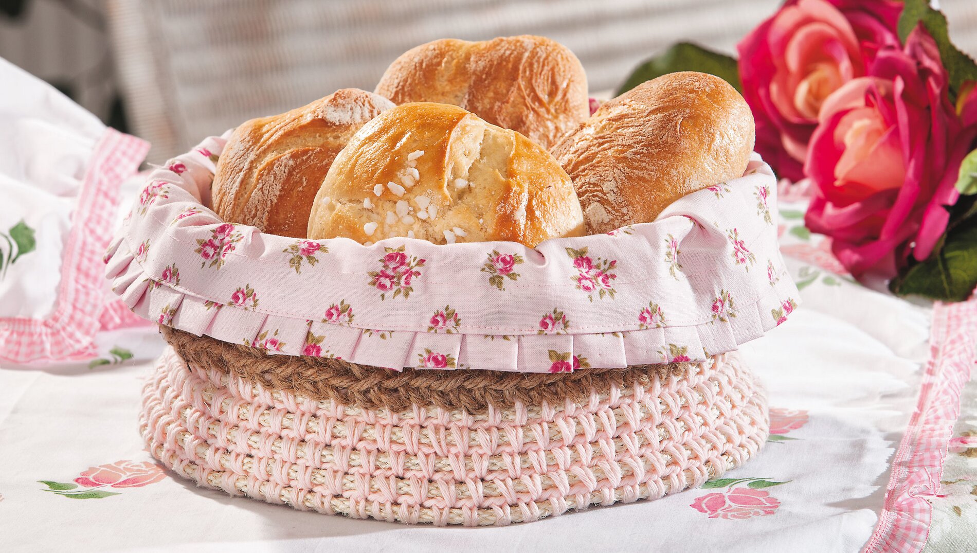 This bread basket in country house style is made of coarse Jute yarn crochet and gets its stability from figure wire. With an inlay of romantic rose fabric it will decorate every breakfast table.