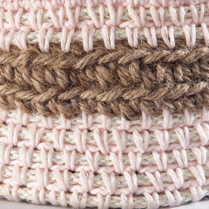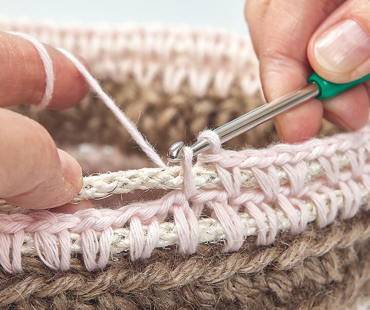 Put on the beginning of the figure wire and crochet with pink Cotton yarn and crochet hook size 4.0 with firm stitches around the plate from Jute yarn . Crochet a firm stitch with cotton in each stitch from Jute yarn , crochet an air stitch between the firm stitches.