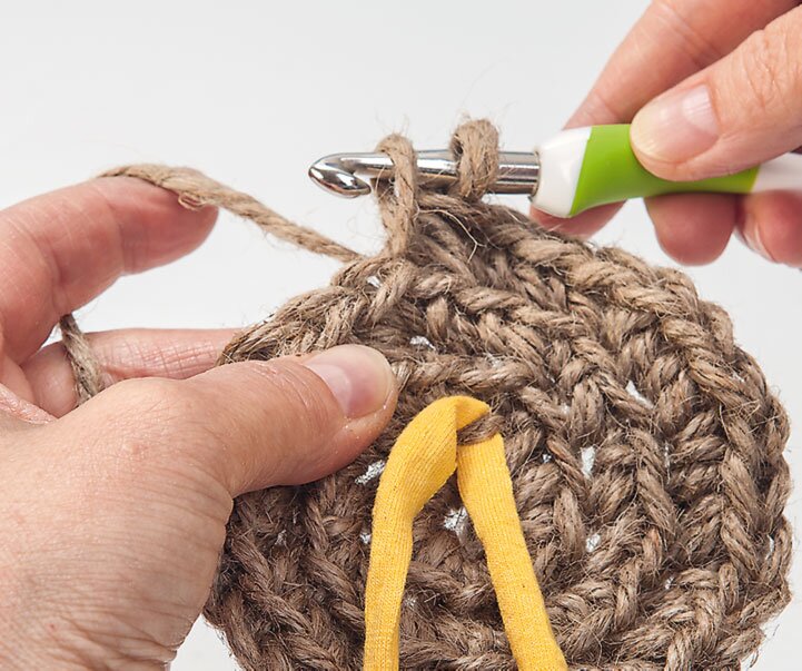 In the next round double every 2nd stitch, then every 3rd stitch, every 4th stitch, etc. until the desired size of the bottom is reached. Then cut the Jute yarn and stitch the thread.