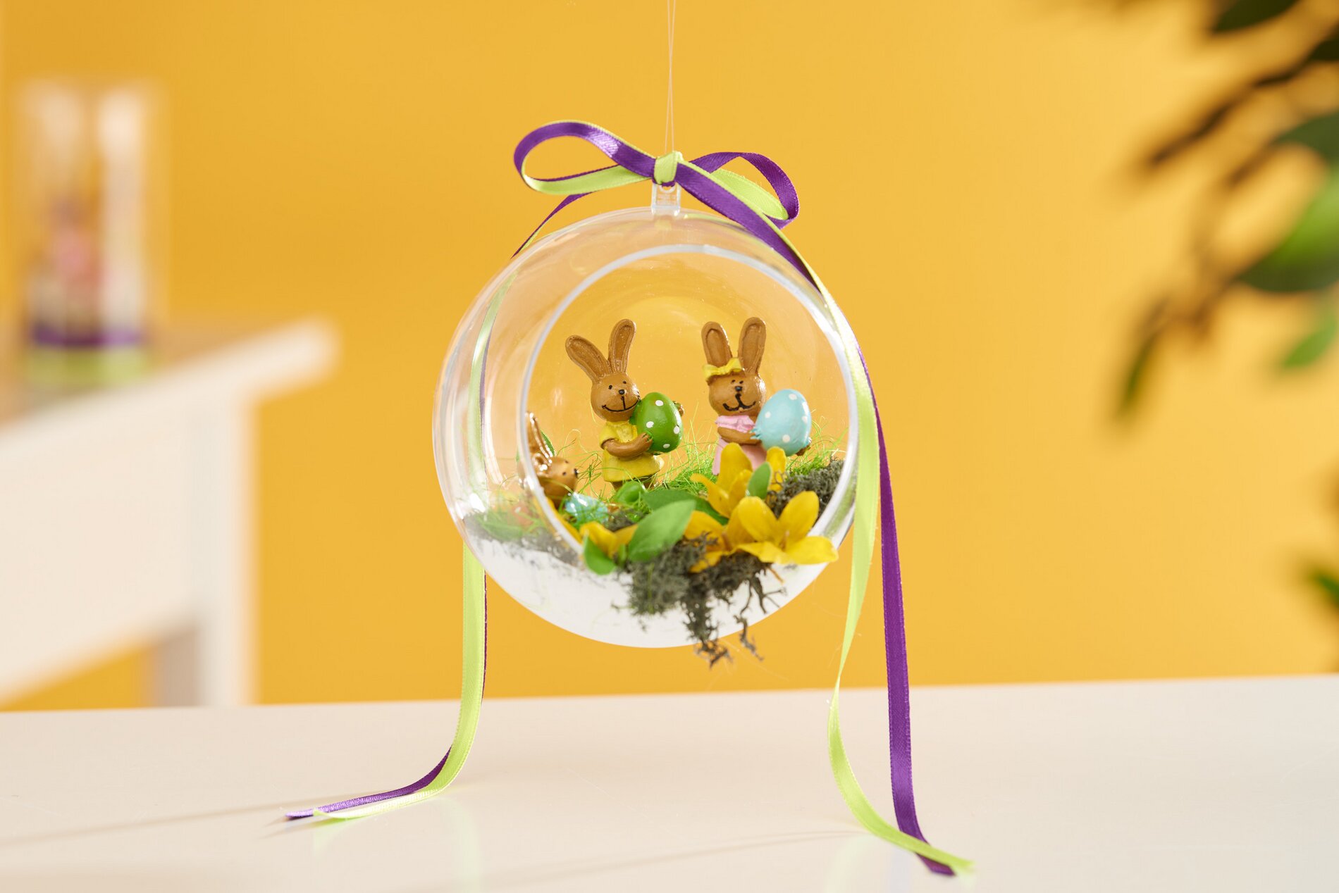 Position the decorative figures and fix them in place. Now you can easily pull a transparent hanging ribbon through the hanging eyelet on the acrylic ball. Finally, place a bow made of satin ribbons on the ball.