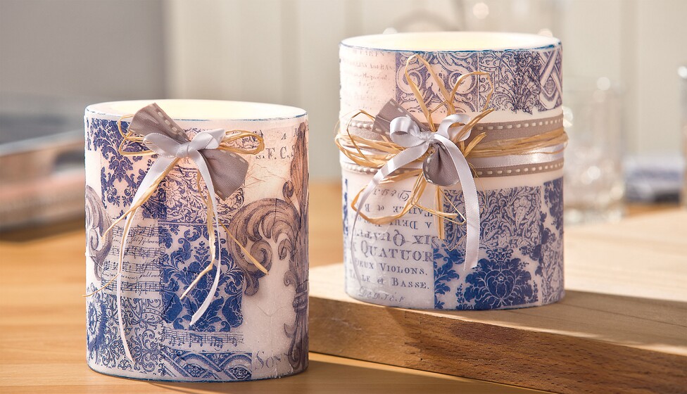 Remove the two unprinted layers of paper and stick the printed layer with Candle Potch on the candle. This special Napkin varnish guarantees a safe burning.