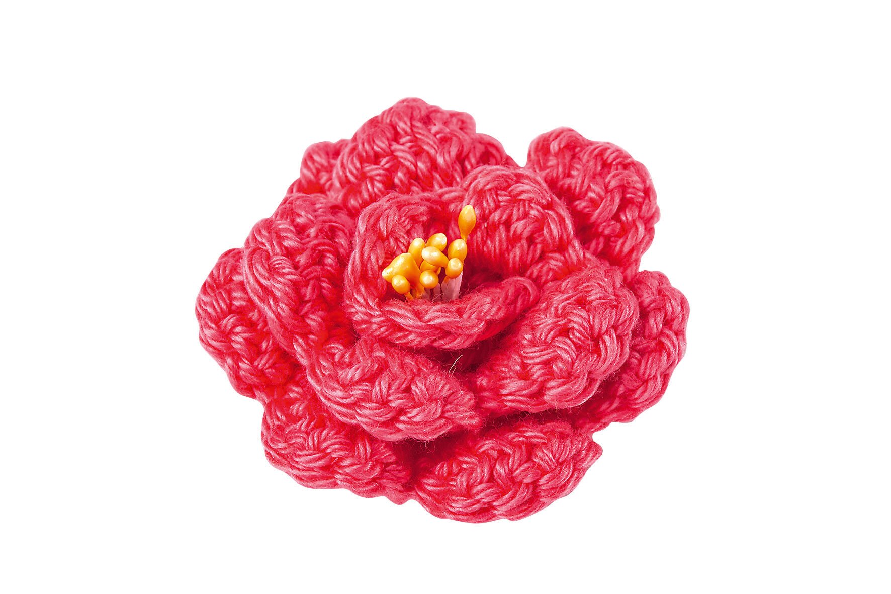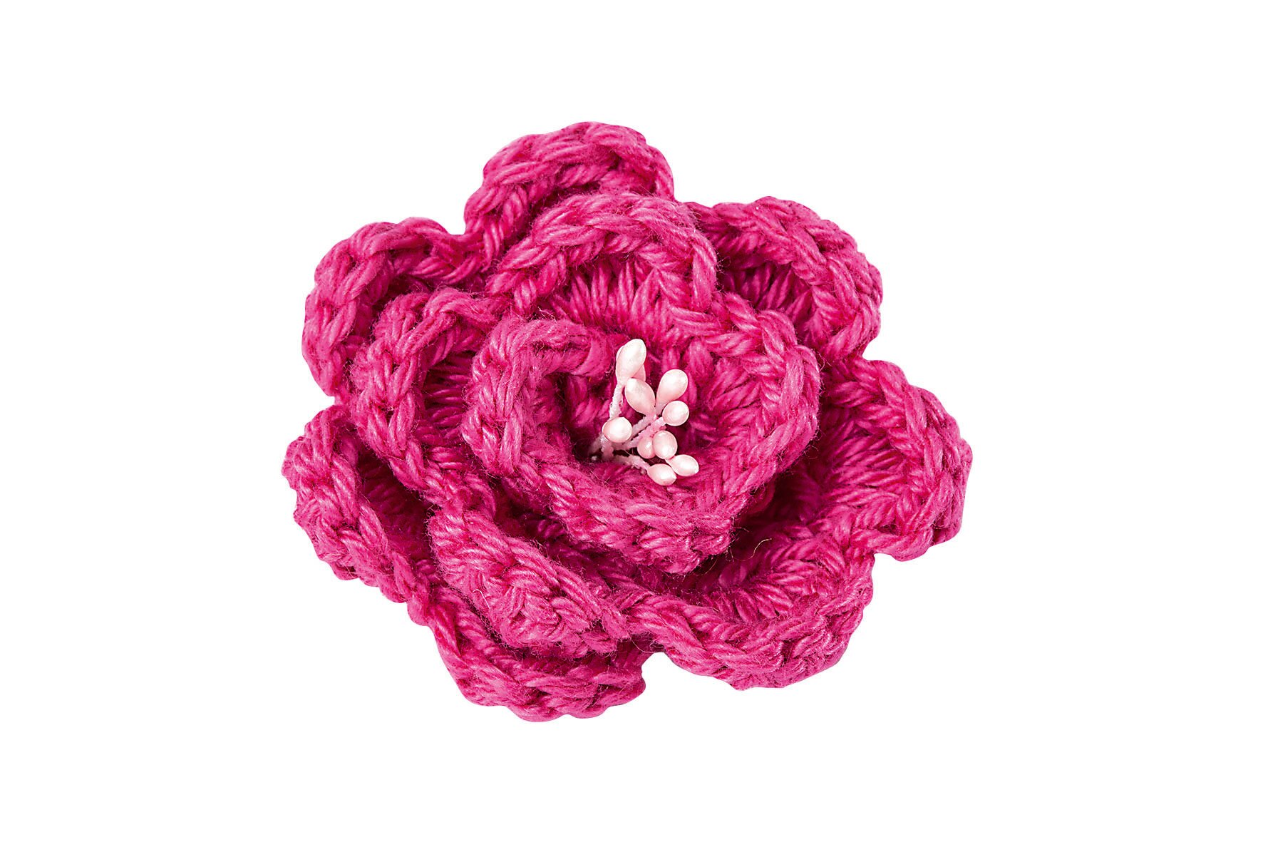 Pull the thread through the last loop, cut and hide it. Bend 5 pistils per flower in the middle and place them at the end with the smaller petals. Roll up the crocheted flower and sew together with the starting thread. Also pierce through the loop of the pistils.