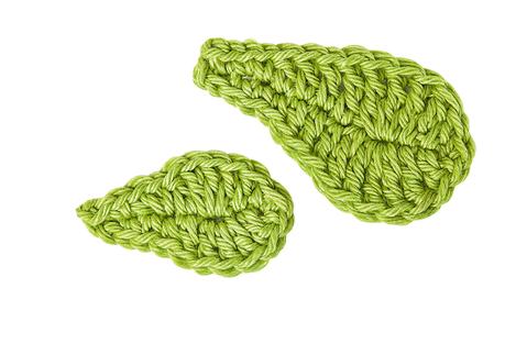 From the green Cotton yarn crochet leaves in different sizes 13 LM crochet. Crochet on ch: 1 dc, 3 dc, 3 tr, 1 double tr, 3 double tr in next ch, 1 double tr, 1 tr, 1 dc Turn the piece and crochet back in the same way on the other side of ch-Chain . Pull the thread through the last loop, cut it off and stitch both threads together. Crochet the small leaves over 9 ch: 1 dc, 3 dc, 1 half tr, 3 tr in 1 dc, 1 half tr, 1 dc, turn over and crochet back.